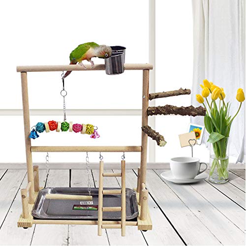 Package includes all the parts of bird stand, screws, a tray, ladder, swing, chewing toy and feeding cups. High quality wood bar,screws connection make it totally safe for your birds, give your birds more space to train.