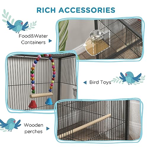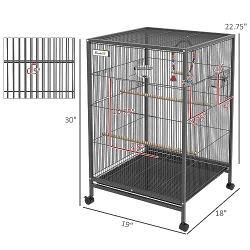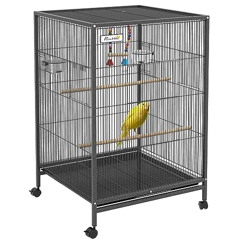 Pawhut Metal Bird Cage with Stand for Parrots, Lovebirds, Finches, Large Bird Cage with Swing, Stainless Steel Bowls, Removable Tray for Small Birds, Gray