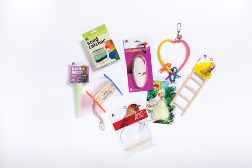 Cups, perches, treats and toys are included