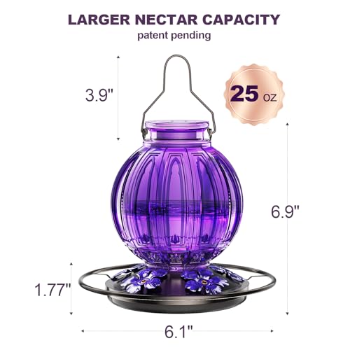 Glass Hummingbird Feeder for Outdoors Hanging, Bird Nectar Feeder with Perch & 5 Flower Feeding Ports, 25 Oz Leak Proof for Outside Garden Decor Backyard, Gifts for Women Mom, Purple