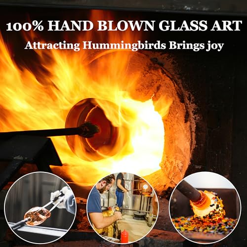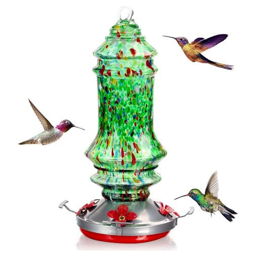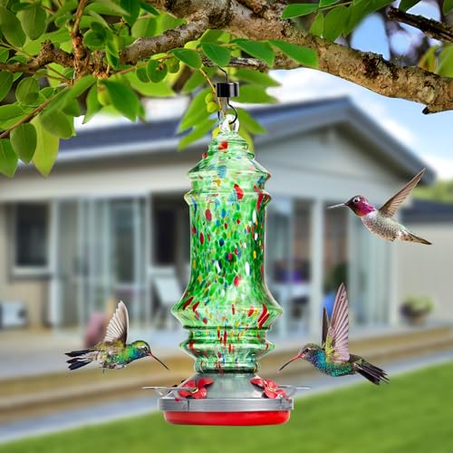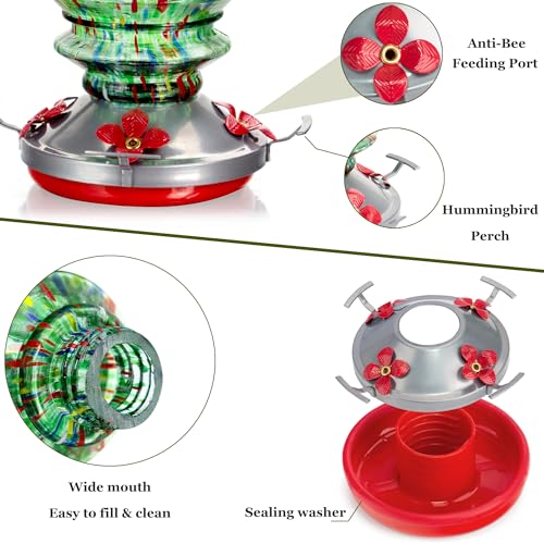 Hand Blown Glass Hummingbird Feeder for Outdoors Hanging, Unique Hummingbird Feeder with Perch, 22 Fl.Oz, Leak Proof, 4 Feeding Ports, Ant Moat Included, Gifts for Mom Older Women (Green)