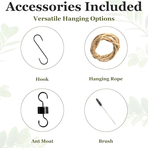 PACKAGE INCLUDED: unique glass hummingbird feeder contains – 1 x ant moat, 1 x s-hook, 1 x hemp rope for hanging hummingbird feeder, 1 x cleaning brush for easy filling, cleaning and hanging