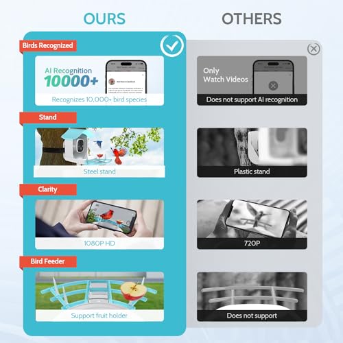 🐦𝐒𝐦𝐚𝐫𝐭 𝐀𝐈 𝐈𝐝𝐞𝐧𝐭𝐢𝐟𝐢𝐞𝐬 𝟏𝟎,𝟎𝟎𝟎+ 𝐁𝐢𝐫𝐝 𝐒𝐩𝐞𝐜𝐢𝐞𝐬: Let birdwatching with binoculars become a thing of the past! Our smart bird feeder camera is equipped with a powerful AI algorithm that can identify over 10,000 types and species of birds. You can easily access the recognition results and learn more about the bird species that visit your feeder.