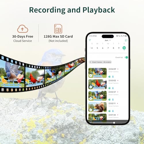 Bird Species Recognition – With its smart AI bird feeder camera, Twesync immediately identifies all visiting birds for you, recognizing over 11,000 bird species (free for 30 days). Including that rare one you’ve always wondered about! You could never get as close to your shy feathered friends as your bird camera feeder can.This smart bird feeder with camera can record videos and store them in the cloud (free for 30 days) or on an SD card (up to 128GB, not included).