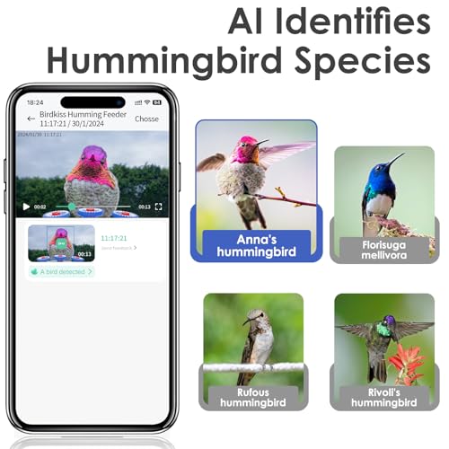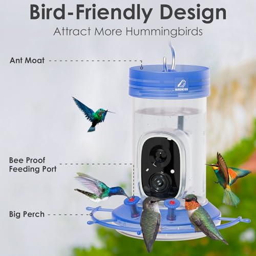 【Smart Hummingbird Feeder for Your Backyard】 Birdkiss hummingbird feeder camera AI recognition technology identifies hummingbird species and get real-time notifications, watching live video of visiting hummingbirds, making it easy to learn about and monitor hummingbird. You can easily watch auto recording videos and witness the marvelous hummingbird activities using the mobile app.