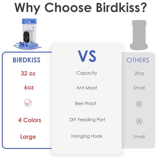 【Ant Moat, Bee proof & Large Capacity】Say goodbye to ant and bee troubles with our specially designed Birdkiss hummingbird feeder for outdoor hanging. With a generous 32 ounce capacity, you can keep a plentiful supply of fresh nectar, providing feathered friends with a delightful treat. Featuring three flower-shaped feeding ports complete with perches, our feeder makes it effortlessly easy to both feed and observe your hummingbirds. The feeder ensures a secure seal via two gasket rings.