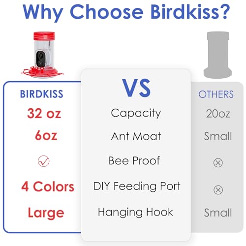 Ant Moat, Bee proof & Large Capacity: Say goodbye to ant and bee troubles with our specially designed Birdkiss hummingbird feeder for outdoor hanging. With a generous 32 ounce capacity, you can keep a plentiful supply of fresh nectar, providing feathered friends with a delightful treat. Featuring three flower-shaped feeding ports complete with perches, our feeder makes it effortlessly easy to both feed and observe your hummingbirds. The feeder ensures a secure seal via two gasket rings.