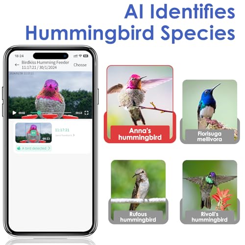 Smart Hummingbird Feeder for Your Backyard: Birdkiss hummingbird feeder camera AI recognition technology identifies hummingbird species and get real-time notifications, watching live video of visiting hummingbirds, making it easy to learn about and monitor hummingbird. You can easily watch auto recording videos and witness the marvelous hummingbird activities using the mobile app.