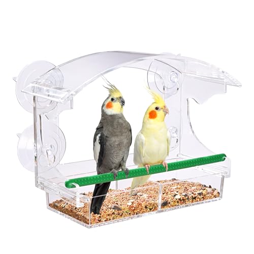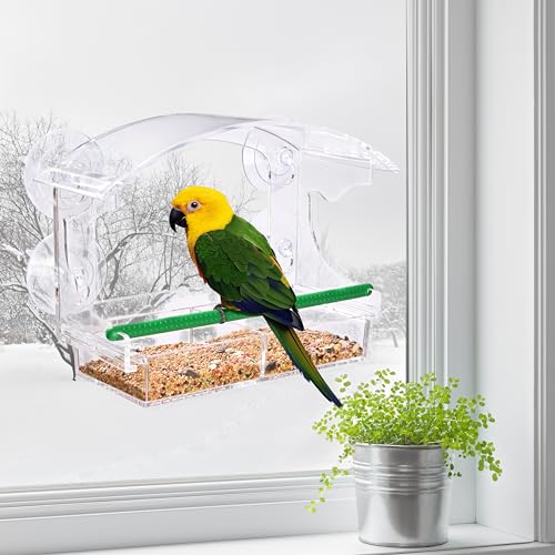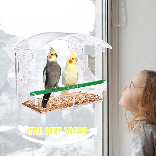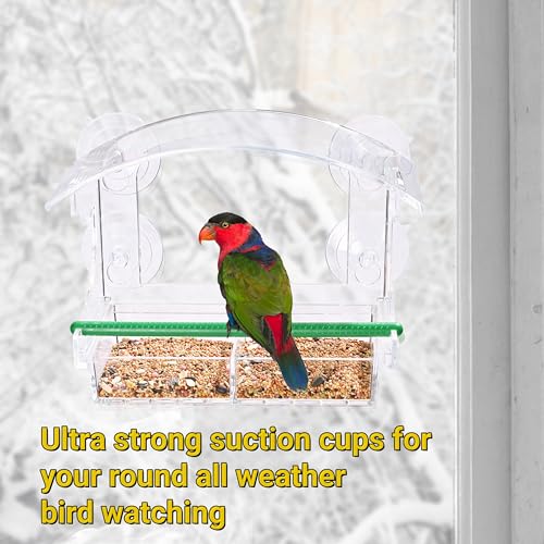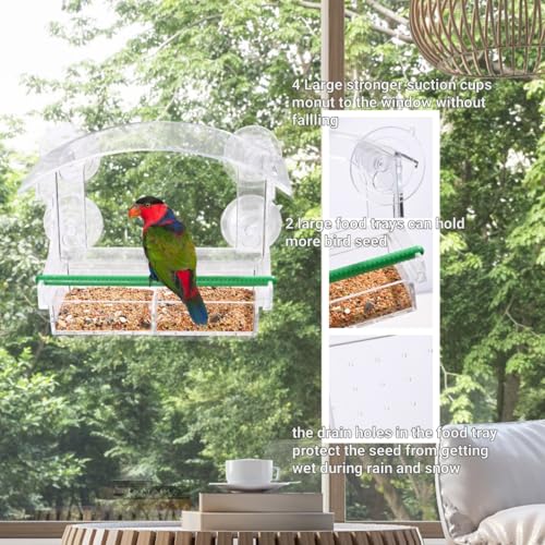 【UPGRADED DESIGN】: This window bird feeder is equipped with 4 strongest suction cups,the acrylic feeder are superior quality acrylic. Our feeder is all one piece shatterproof expected, and can withstand any harsh weather conditions. The design of larger panoramic area is not only beautiful but also easier to get a unobstructed viewing.