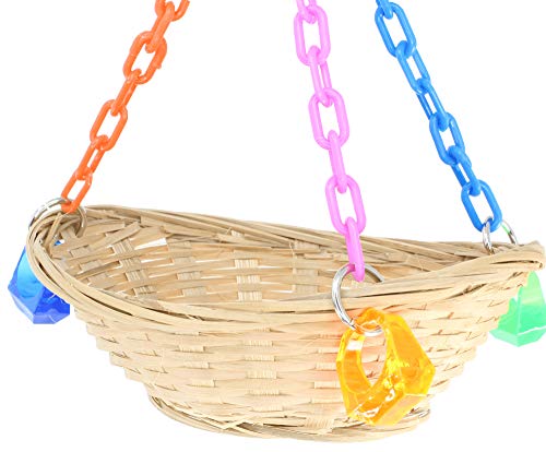 The 1914 Basket Swing from Bonka Bird Toys is a fun and colorful bamboo swing for your small sized feathered friend. This swing has a natural chewable basket and great colorful small link chains that hang it! At the top of the link chains are a quick link connector for fast and easy hanging in the bird cage. From here (3) small colorful plastic chains hang down which connect to the basket itself. These plastic chains are assorted in bright bird pleasing colors and are sure to stand out in the aviary. Sturdy metal rings loop through the plastic chains and connect them to the bamboo basket. From these sturdy rings also hang colorful translucent acrylic rings. The swing is a woven basket made from all natural bamboo that looks wonderful with its natural bamboo color. Its as much fun to chew as it is to sit in with all of the colorful acrylic rings dangling around! The basket is perfect for adding shredding and foraging material and the sturdy metal rings can easily hang other items from the bird toy. Bird toys like these are perfect for smaller sized cages as they add color, hanging and chewing fun all in one! The 1914 Basket Swing is 100% bird safe¬ships with bright assorted bird pleasing colored chains¬and weighs and measure approximately: Height:¬(8) inches Depth:¬(5.25) inches or (5 1/4) inches Width:¬(7.25) inches or (7 1/4) inches Weight:¬Under (3) ounces‚Į * Colorful and chewable bamboo swing. * Bright plastic chain. * Great bamboo basket. * Quick link for easy cage placement. * 100% bird safe.