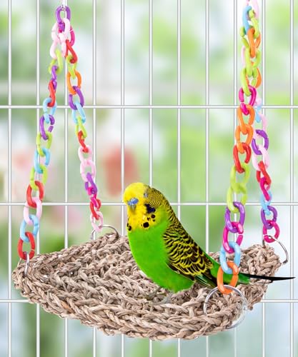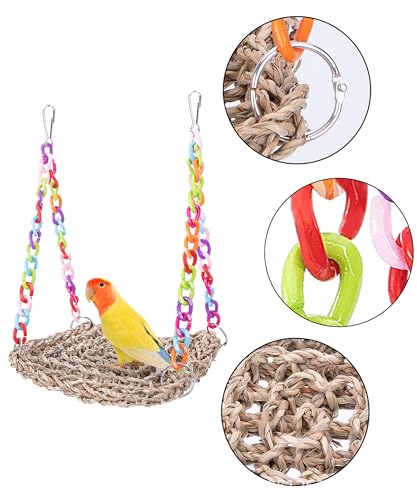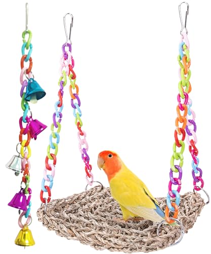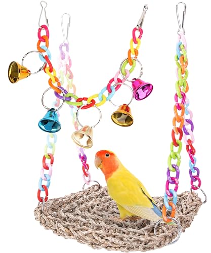 SAFE MATERIAL: Bird swing mat is made of natural seagrass, With 4 Colorful Chains. bird Swing colorful bells, Colorful and well made, Safe for birdies to chew and play.
