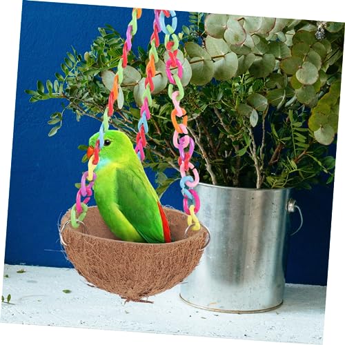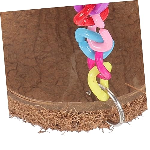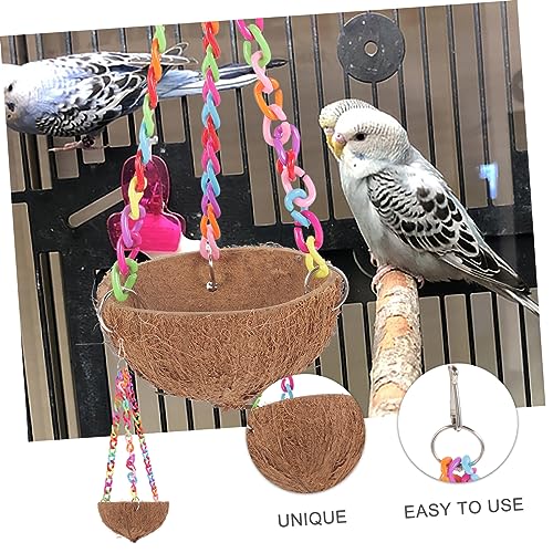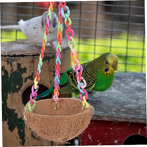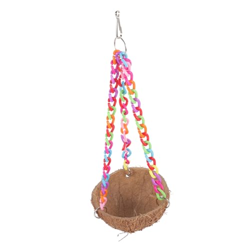 Sleeping bird house: the eye-catching design features a colorful chain and coconut shell nest, making it a stylish addition to any pet’s habitat.