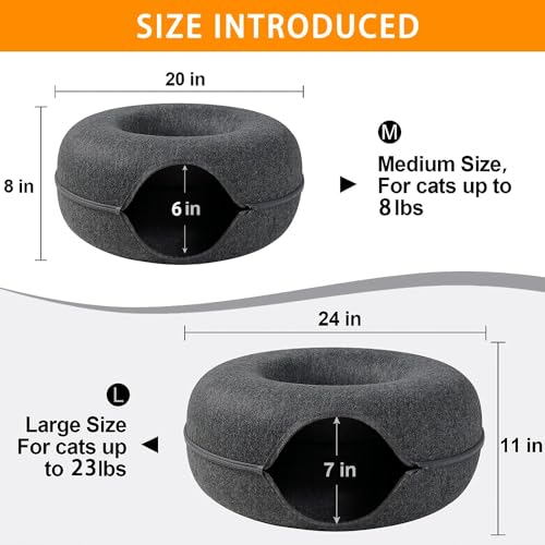 FOR ALL CAT SIZE: In order to make the cat donut fun for all cats, we designed two sizes of cat tunnel, one is 20 inches and the other is 24 inches. The 20 inches one is good for cats under 8 lbs, and the 24 inches one is good for cats under 23 lbs.
