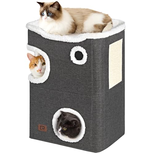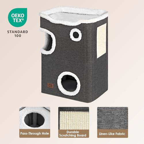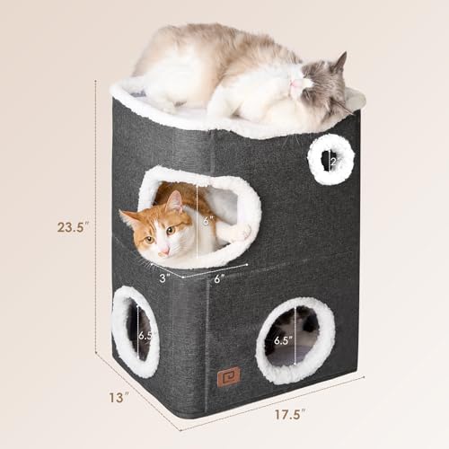 EHEYCIGA 2-Storey Cat House for Indoor Cats Bed Cube, Covered Cat Cave Beds & Furniture with Scratch Pad and Hideaway, Modern Cat Hideout Condos for Multi Pet Large Kitten Kitty, 23.5″ H, Grey