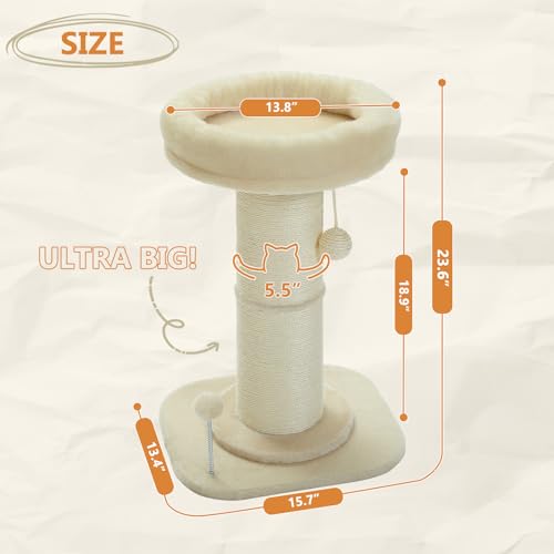 PEQULTI Cat Scratching Post, Tall Cat Scratcher for Indoor Cats with Super Thick Scratching Post [Dia=5.5”], Removable Fluffy Cat Bed, Cat Scratch Post with Spring Ball, Beige