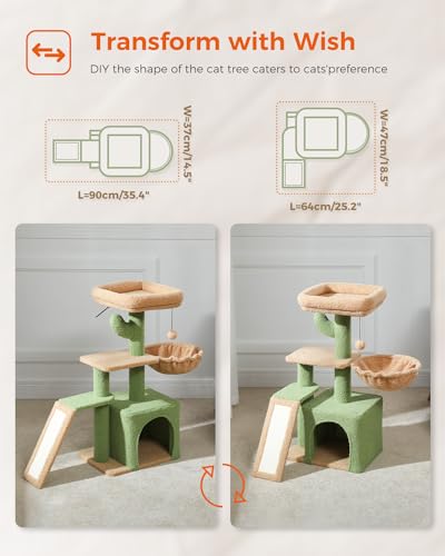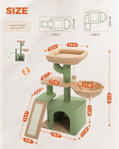 PETEPELA Cactus Cat Tree for Indoor Cats, 31.5” Cute Cat Tower Cat Condo with Sisal Scratching Ramp, Cozy Hammock and Removable Top Bed Perch for Kittens, Green