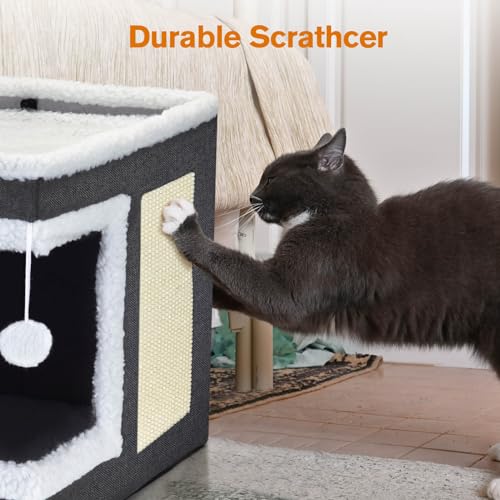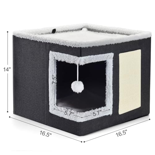 petizer Cat Bed for Indoor Cats, Large Covered Cat House with Scratch Pad, Foldable Cat Cave Bed & Hideaway Cube with Reversible Cushions, Cute Cat Condo for Multi Small Pet Kitten (Dark Grey)