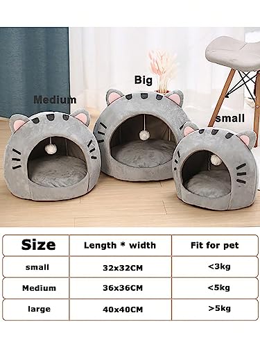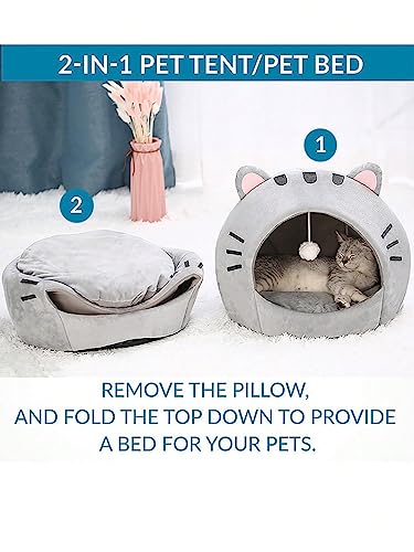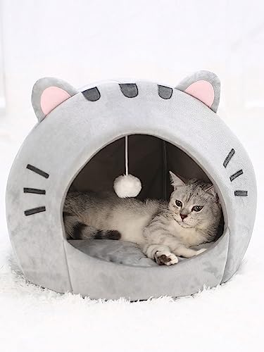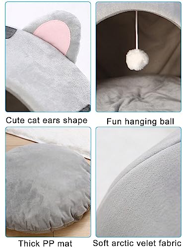 QWINEE Indoor Cat Bed Cave with Removable Cushion – Pet Plush Tent House Cartoon Ear Design Pet Bed with Pompom for Cats Kitten Dogs Puppy and Rabbit Grey L