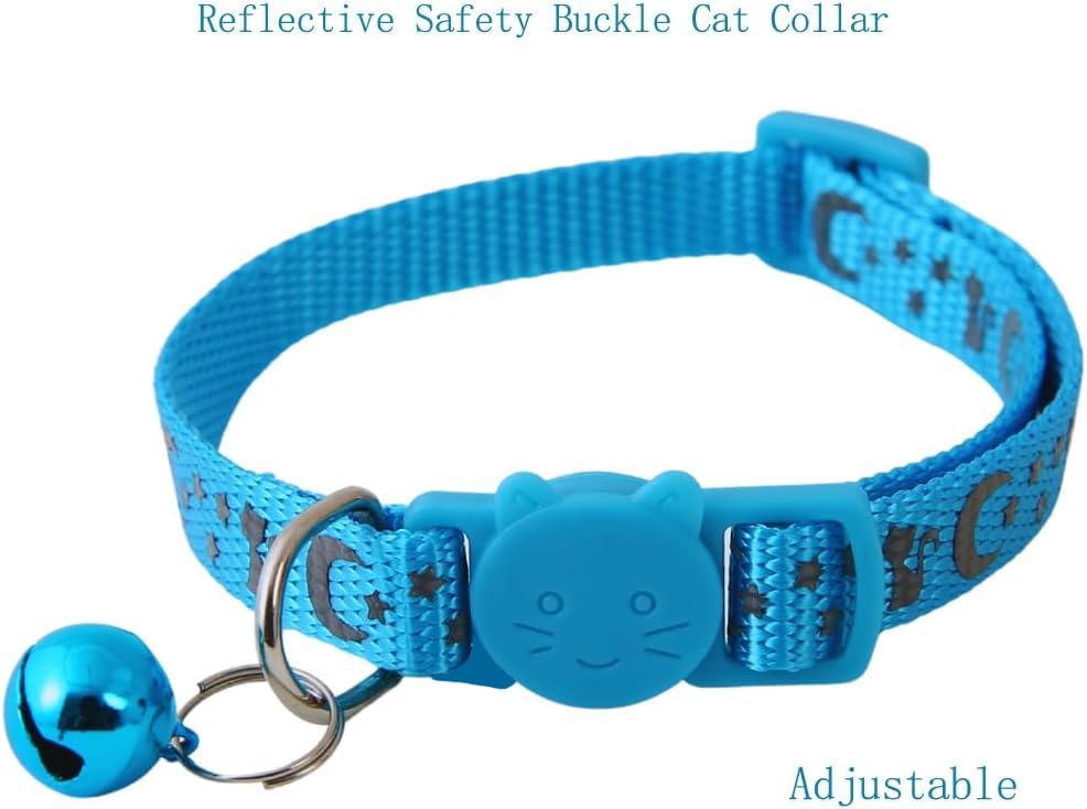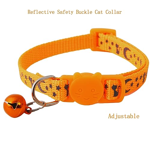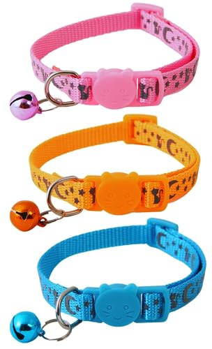 3 Pack Reflective Cat Collars Breakaway, Girl Boy Pet Kitten Collar with Bell, Star Moon Kitten Print, and Safety Buckle (Adjustable 7.5″-12.6″, Pink & Orange & Blue)
