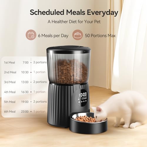 🐱【Scheduled Meals Everyday】Trifuns automatic cat feeder can provide your pet with a personalized customized diet. Set between 1-6 meals per day with 0-50 portion choices available for each meal(10g/portion). You can customize it according to your pet’s eating habits, so you can enjoy uninterrupted sleep and stress-free mornings.