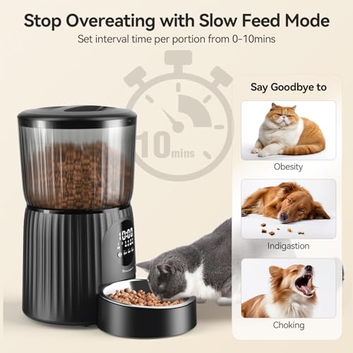 🐱【No Overeating with Slow Feed Mode】The automatic pet feeder allows the feeding interval to be set to 1-10 minutes, the pet feeder will gradually distribute food to prevent pets from eating too fast, can help pets digest, reduce the risk of choking, and promote healthier eating habits.