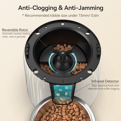 🐱【Anti-Clogging & Anti-Jamming】The auto cat feeder is equipped with an infrared detector, which can stop dispensing food when it detects that the food outlet is blocked; the reversible rotor can automatically reverse when the rotor is stuck, keeping your feeder in good condition and keep your pet safe.
