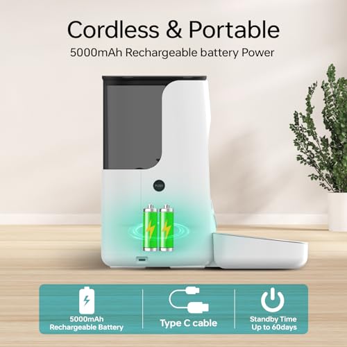 【5000mAh Battery Operated】Dogness wifi pet feeder Built-in 5000mAh rechargeable Li-Ion battery that can last feeding up to 60 Days when fully charged. No need to prepare D-type batteries, which is convenient and less costly.Also no worry about your pet chewying the cord.