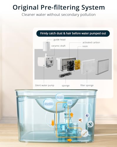 Front-Positioned Filter for Fresher Water: The front-mounted design ensures that the water is filtered just before it reaches the pump, protecting the water pump and extending its lifespan. With a 3-layer filter system (resin, activated carbon, sponge), the cat fountain provides fresher and better-tasting water.