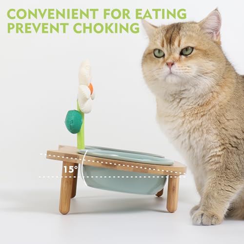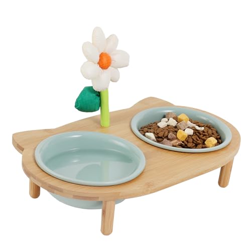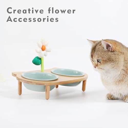Elevated Cat Ceramic Bowls Stand, Small Dog, Anti Vomit, Tilted Feeding Position, Full Bamboo Body Stand with Decorate Flowers, Raised Food Feeding Dishes for Cats and Puppy (S-Green)