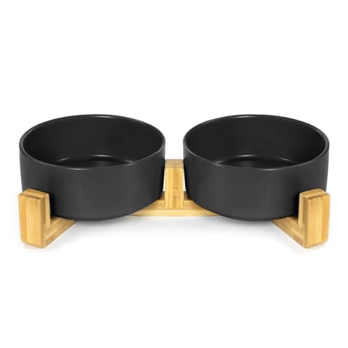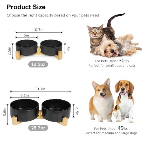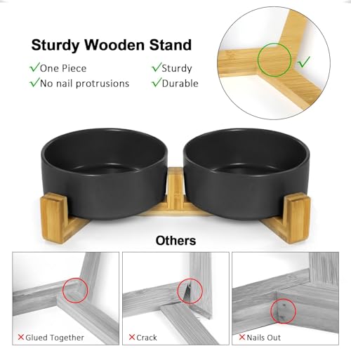 Nepfaivy Dog Bowls, Ceramic Dog Bowls with Wooden Stand, 13.5oz Dog Food and Water Bowl Set for Small Size Dogs, Puppies and Indoor Cats, Weighted Dog Dishes, Basic Pet Feeding Station, Black
