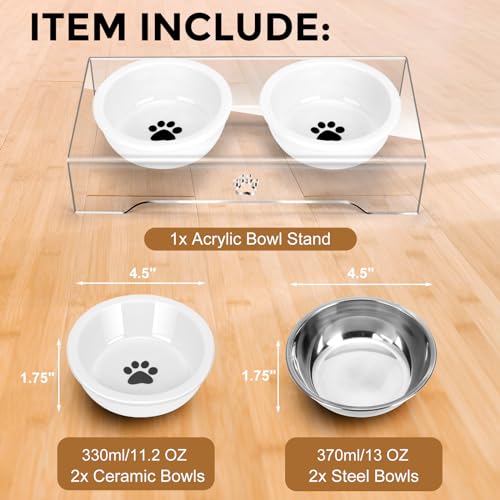 Water Resistance: The 2 ceramic and 2 stainless steel cat bowls with Acrylic stand are water-resistant, ensuring durability and preventing any leakage or spills.