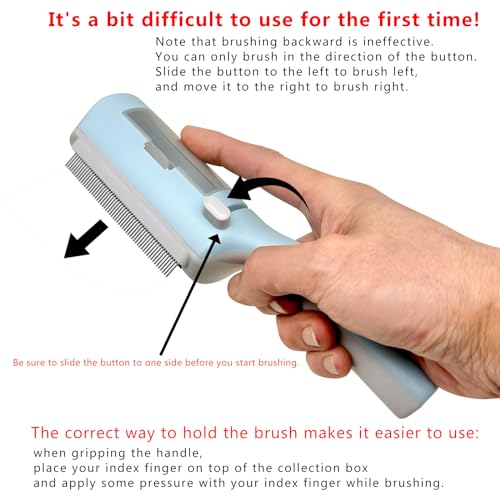【Pet dry cleaning and hair removal brush】It’s a bit difficult to use for the first time!You can only brush in the direction of the button. Slide the button to the left to brush left, and move it to the right to brush right.The correct way to hold the brush makes it easier to use: when gripping the handle, place your index finger on top of the collection box and apply some pressure with your index finger while brushing.