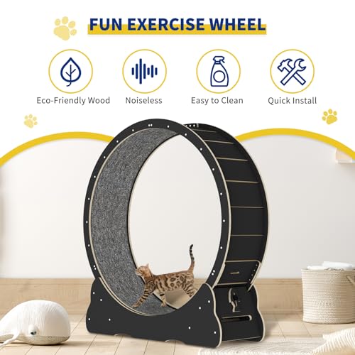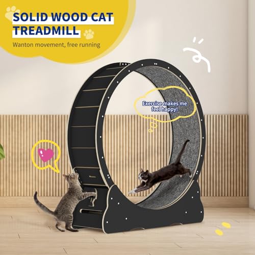 Cat Wheel, 35.4” Cat Exercise Wheel with 2 Anti-Scratch Pads, Solid Wood Cat Wheel Exerciser for Indoor Cats for Walking, Running, Training, Cat Treadmill Suitable for Most Cats (Black)