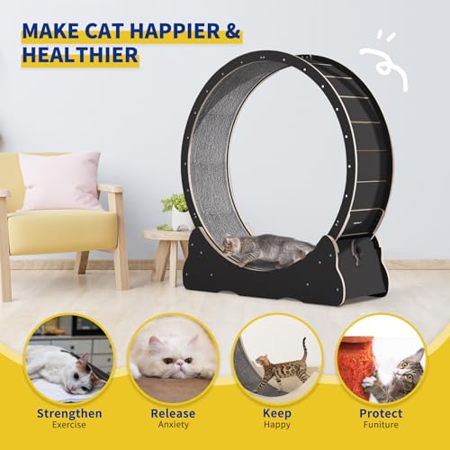 ENCOURAGE PET ENTERTAINMENT: Our cat wheel will help your lovely friend strengthen exercise, release anxiety, keep happy, and protect the furniture. It will provide your cat with hours of fun and exercise. By training their cats to use the wheel and making it a positive experience, owners can promote good exercise habits and help their pets live healthy and get.