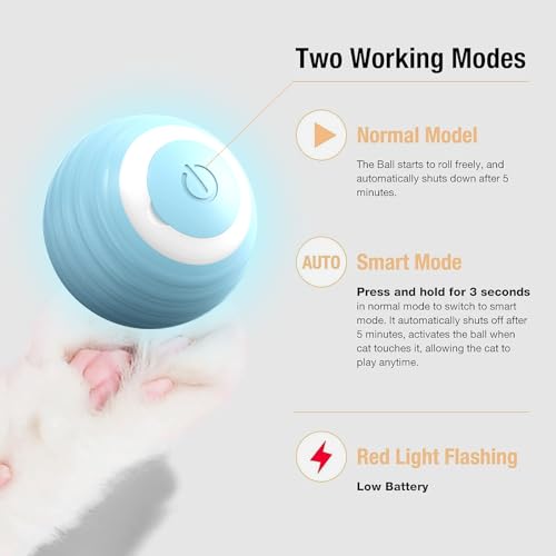 😺【𝐂𝐀𝐓 𝐁𝐀𝐋𝐋 𝐇𝐀𝐒 𝟐 𝐌𝐎𝐃𝐄𝐒】Smart Mode and Normal Mode. After the cat ball is turned on, it will automatically move, shake or bounce, attracting cats to chase after it, without APP control, and it will enter the standby state after 5 minutes. Switch at will to suit different play styles for timid or active cats.