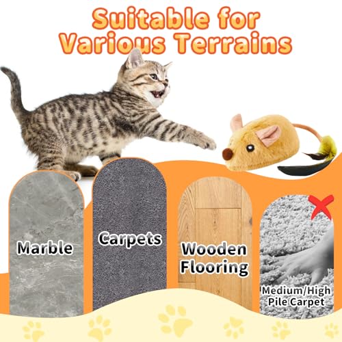 【Versatile for Various Surfaces】Equipped with smooth and sturdy wheels, our electric cat mouse toy can seamlessly glide across different types of hard floors, including marble, wood, and tile. This enables your cat to enjoy endless hours of playtime without worrying about the toy getting stuck or losing momentum.