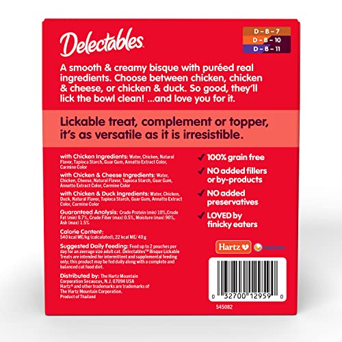 Your favorite lickable cat treats are now available in a Non-Seafood Bisque formula! Hartz Delectables unique wet treats combine real ingredients with a smooth sauce, your kitty will be begging for more! This nutritious seafood-free recipe entangles the meat and sauce together so your cat can not only lick up the sauce but enjoy (and gobble up!) the meat too. Even the most finicky eaters enjoy this delectable wet treat – use the single serve pouch as a cat food topper, a quick snack, or a special treat and your cat will love you back! This pack includes 12 – 1.4-ounce pouches of pure kitty satisfaction.