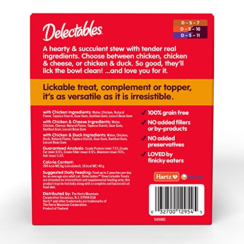 Your favorite lickable cat treats are now available in a Non-Seafood Stew formula! Hartz Delectables unique wet treats combine real ingredients with a hearty sauce, your kitty will be begging for more! This nutritious seafood-free recipe entangles the meat and sauce together so your cat can not only lick up the sauce but enjoy (and gobble up!) the meat too. Even the most finicky eaters enjoy this delectable wet treat – use the single serve pouch as a cat food topper, a quick snack, or a special treat and your cat will love you back! This pack includes 12 – 1.4-ounce pouches of pure kitty satisfaction.