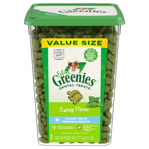 This convenient tub contains 9.75 oz. of FELINE GREENIES Crunchy Dental Treats in Catnip Flavor