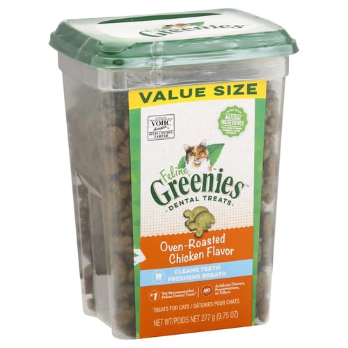 This convenient tub contains 9.75 oz. of FELINE GREENIES Crunchy Dental Treats in Oven Roasted Chicken Flavor