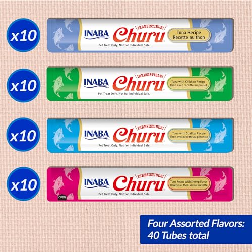 INABA Churu Cat Treats, Grain-Free, Lickable, Squeezable Creamy Purée Cat Treat/Topper with Vitamin E & Taurine, 0.5 Ounces Each, 40 Tubes, Tuna & Seafood Variety Box