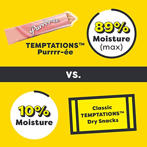 Treat time is your cat’s favorite time of day. Make it even more purrrr-fect with TEMPTATIONS Creamy Puree with Chicken, Salmon, and Tuna Lickable Cat Treats. These irresistible cat squeeze treats deliver the delicious chicken, salmon, and tuna tastes cats love in the perfectly creamy texture they can’t get enough of! Serve these squeezable cat treats by hand for a playful bonding moment, in a bowl as a snack, or as an extra special cat food topper to make mealtime fun! The possibilities are endless with this interactive cat treat! Plus, these lickable cat treats come in a single-serve cat treat tube for convenience and less mess… Just open, squeeze, and serve! Temptations puree is made with real chicken, salmon and tuna, has no fillers, and is formulated without corn, wheat, or soy to give your cat a delicious treat. Whether your furry friend is an adult or senior, these fun cat squeeze treats are the perfect snack at less than 15 calories per pouch. We’re paw-sitive your cat will enjoy the delectable taste of TEMPTATIONS Creamy Puree with Chicken, Salmon, and Tuna Lickable Cat Treats!