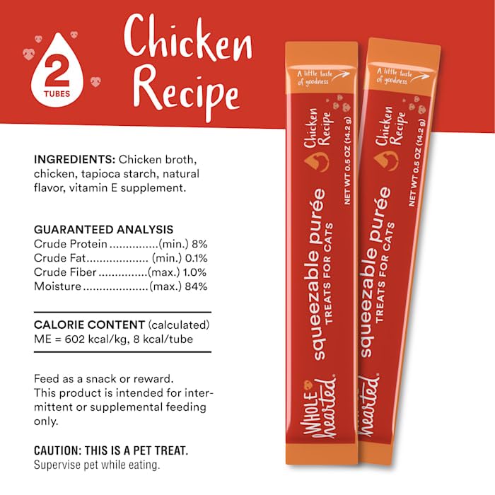 The Wholehearted Squeezable Puree Cat Treat Variety Pack brings you closer to your feline with a tube designed for delightful one-on-one time. Use it as an enticing way to top off their daily meals or offer them on their own to give your cat a tasty reason to meow for joy.