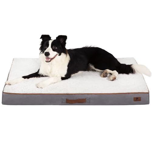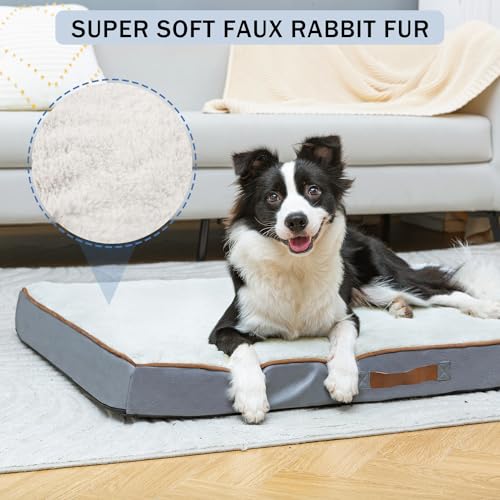 Flat Orthopedic Dog Bed with Momory Foam for Extra Large Dogs, Ultra Soft Comfortable Faux Rabbit Fur Pet Crate Pads with Waterproof Removable Washable Cover, Egg Crate Non-Slip Bottom
