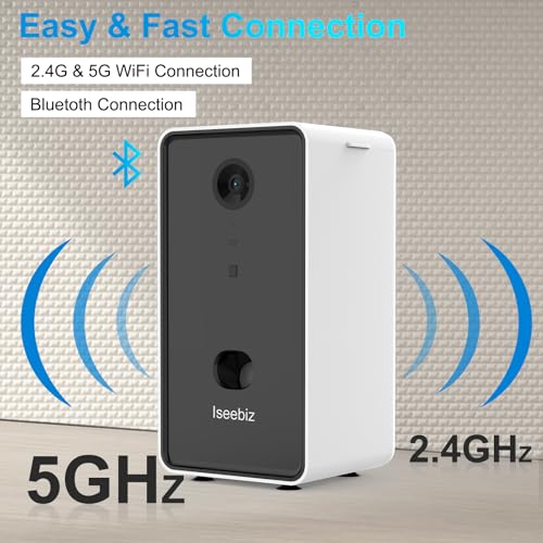 [Easy 2-Min Setup with Video Guidance]: 1) plug in to a power outlet using its USB cord 2) download the Iseefeeder app 3) connect to your 2.4GHz & 5 GHz home Wi-Fi network. Add voice control by combining with an Alexa device, add Iseebiz to your Alexa skills, ask Alexa to toss a treat to your fur kid when you are home. This device is compatible with 2.4G and 5G Wi-Fi, with Bluetooth connectivity, which make it is more convenient, easy, and fast to connect the pet camera with the APP.