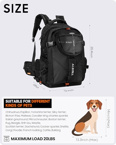 【Holds pets up to 20 lbs】 – ALBINA Dog Backpack measures 20.47×12.99×9.84 inches (52×33×25 cm), suitable for pets up to 20 lbs.