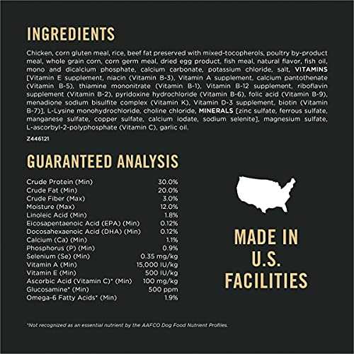 Keep nutrition a top priority when you feed your dog Purina Pro Plan Brand Dog Food PERFORMANCE 30/20 Chicken and Rice Formula dry dog food. Designed for highly active dogs, this high-protein dry dog food appeals to owners of sporting dogs, cattle dogs, hunting dogs and competitive canine athletes. The formula concentrates nutrition to help optimize oxygen metabolism for increased endurance. This Pro Plan dog food formula contains a blend of 30 percent protein and 20 percent fat to assist in caring for your dog’s metabolic needs and help him maintain lean, strong muscles. Each delicious bite features chicken as the first ingredient and provides your dog with the protein and nutrients he needs to lead an active lifestyle. The tasty, antioxidant-rich formula doesn’t just fuel your dog’s body; it also nourishes his immune system. Offer your dog 100 percent complete and balanced nutrition by giving him this dog dry food on a daily basis.