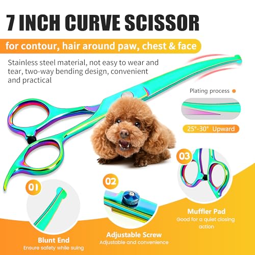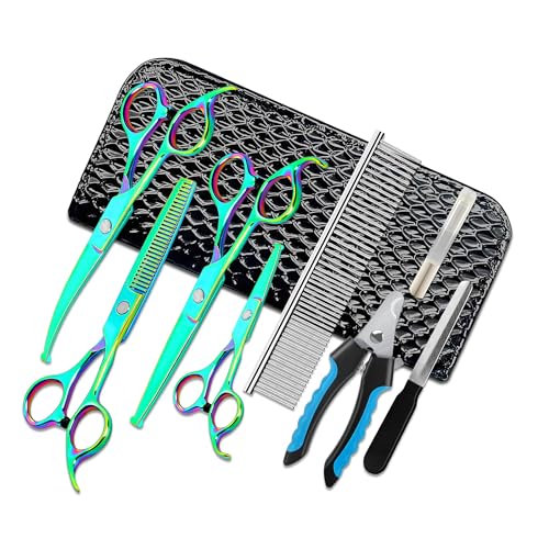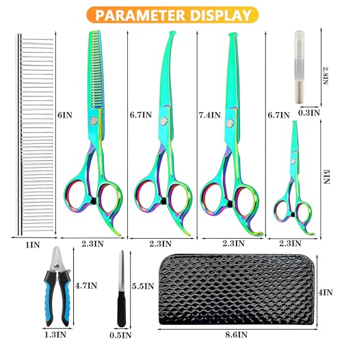 PERFECT COMBINATION: The pet grooming kit includes 2 cutting scissors of different sizes, 1 thinning scissors, 1 curved scissors, 1 grooming comb, 1 nail clipper, 1 nail file, 1 bottle of lubricating oil, and 1 scissors box. It can satisfy your everyday grooming needs.