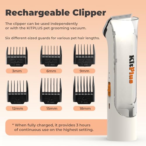 【RECHARGEABLE CLIPPER】- The clipper can be used independently or with the pet grooming vacuum. When fully charged, it provides 3 hours of continuous use on the highest setting.