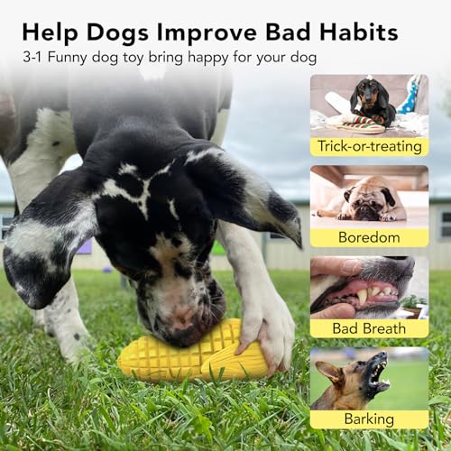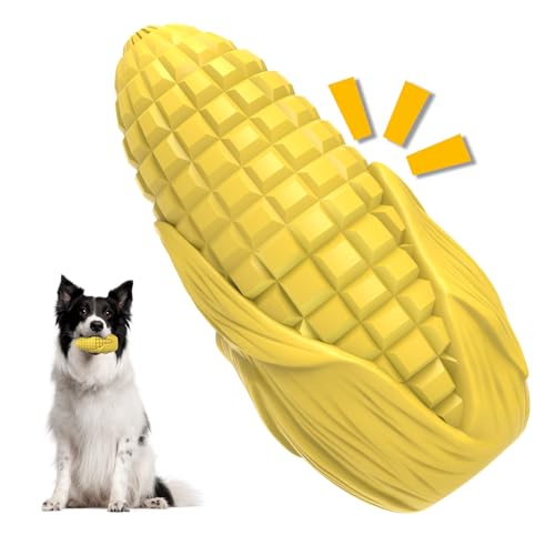 🌽【Safe and Durable】Size, 6.7 x 3.2 x 3.2 in. The dog rubber toy is designed for medium/ large aggressive chewers who love to chew and gnaw. Tough food-grade material ensures dog safety and toy sturdiness. No toy is indestructible, but this one is the closest.